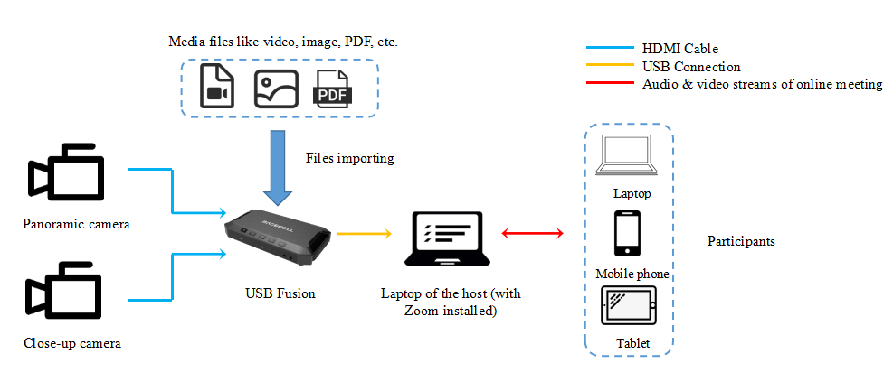 1. USB Fusion offers two live HDMI inputs and one live USB webcam input while also allowing users to add images, pre-recorded video clips, background music, PDF files, web pages, watermarks, and annotations into their presentation. The combination of live video and multiple media files makes the resulting online recruiting experience more attractive.