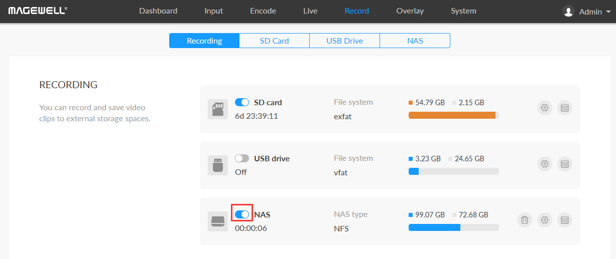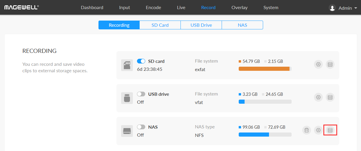 4. In the NAS row, you can optionally click the right icon to set a recording schedule if desired. For details, please refer to the blog Scheduling Live Streaming & Recording with Magewell Ultra Encode AIO.