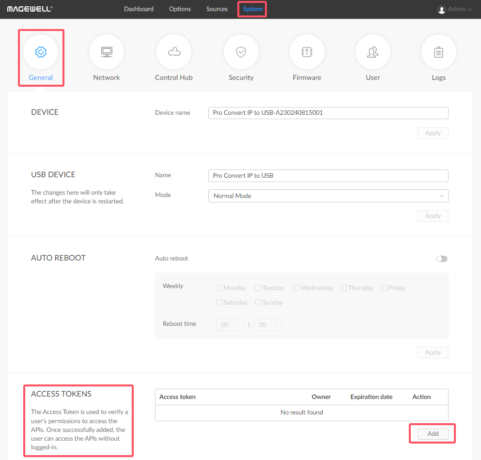 1. Log in to the device's Web UI, then navigate to System → General → ACCESS TOKENS and click Add.
