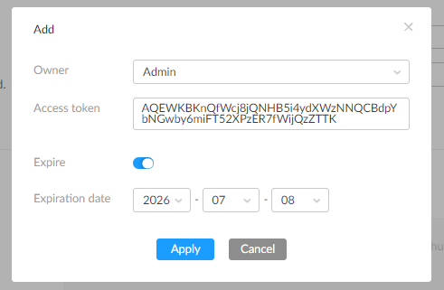 2. In the pop-up window, select the Owner, set the Token expiration date, and click Apply.