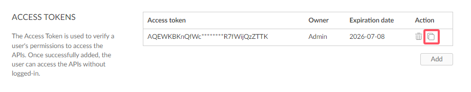 3. Click the Copy icon on the far right to copy the newly created Token. Once the Token is copied, multiple API calls can be executed without repeated logins.