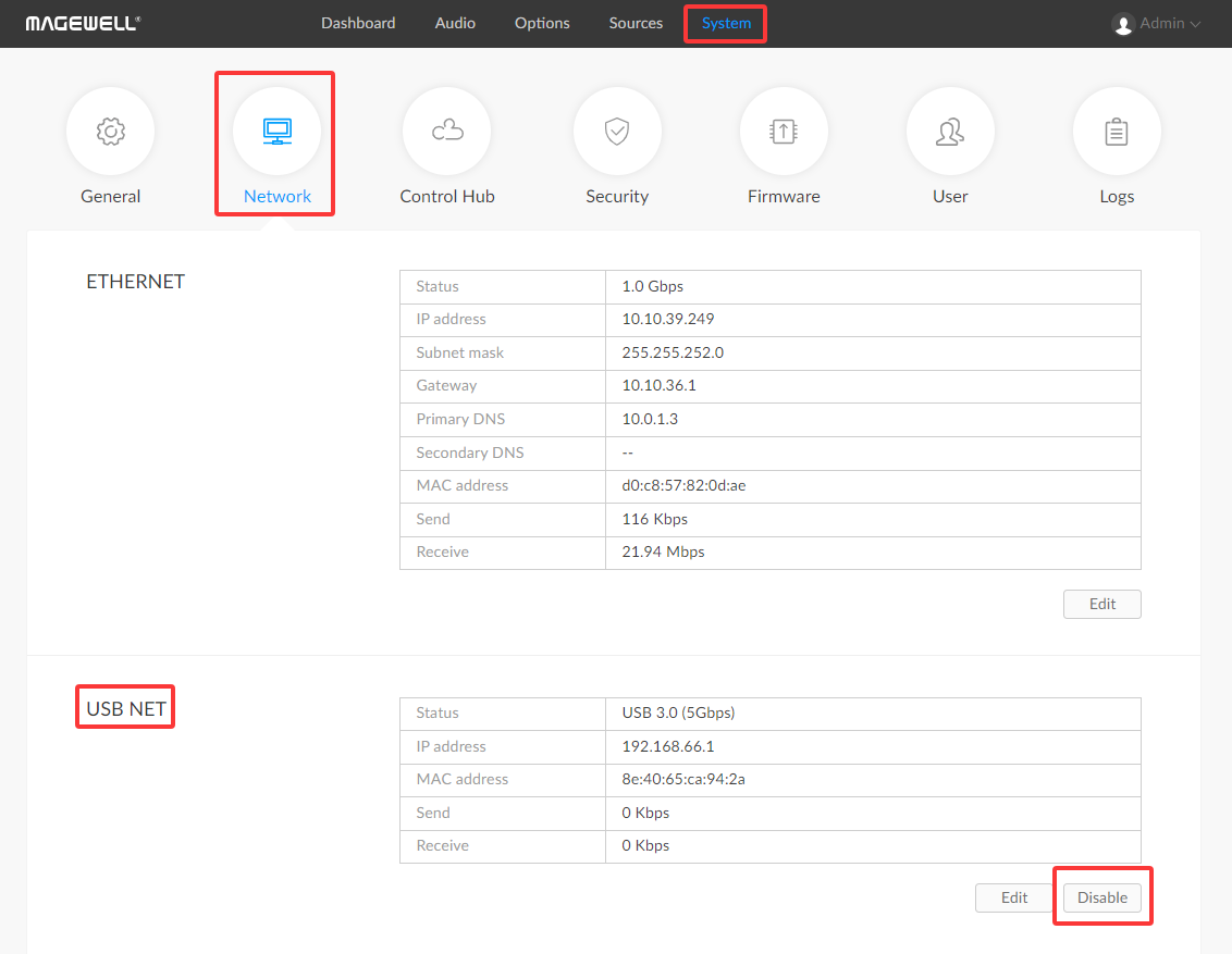 To address this, Magewell introduces a "Disable USB NET" option in the web GUI of Pro Convert IP to USB in the new firmware version 1.0.192. When enabled, the device will no longer establish a network connection via the USB interface, ensuring a stable internet experience.