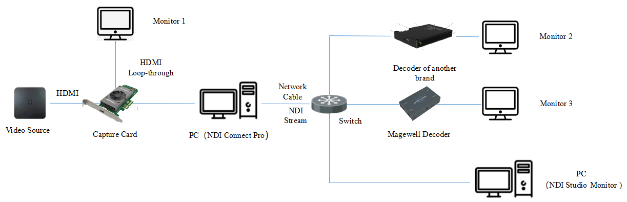 We use Magewell capture card and NDI Connect Pro to encode the video source and transmit it to the LAN through NDI® protocol. At the same time, the loop-through interface of the capture card is connected to Monitor 1. Since the loop through isn't processed by any system, and the monitor used in this test has no operating system, the screen it displays can be regarded as the video source itself which can be used for comparison with the displayed screen by decoding .