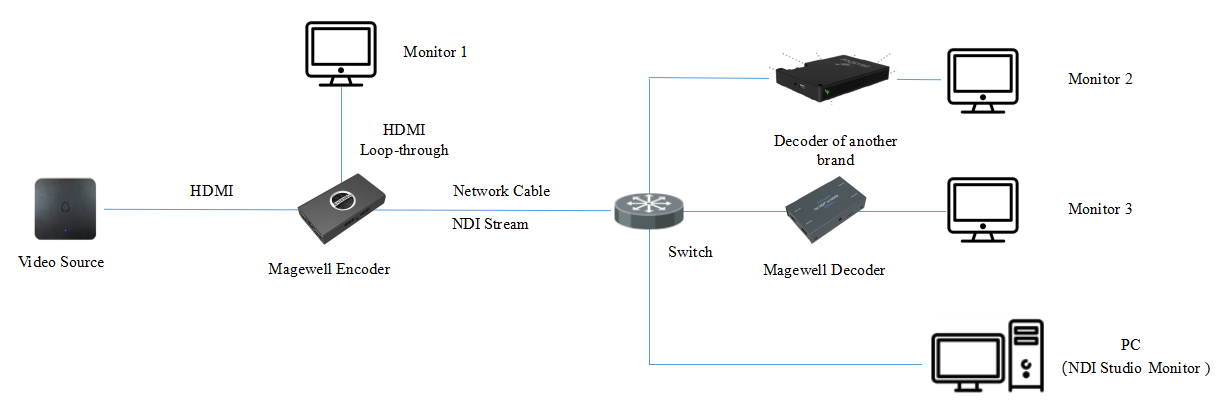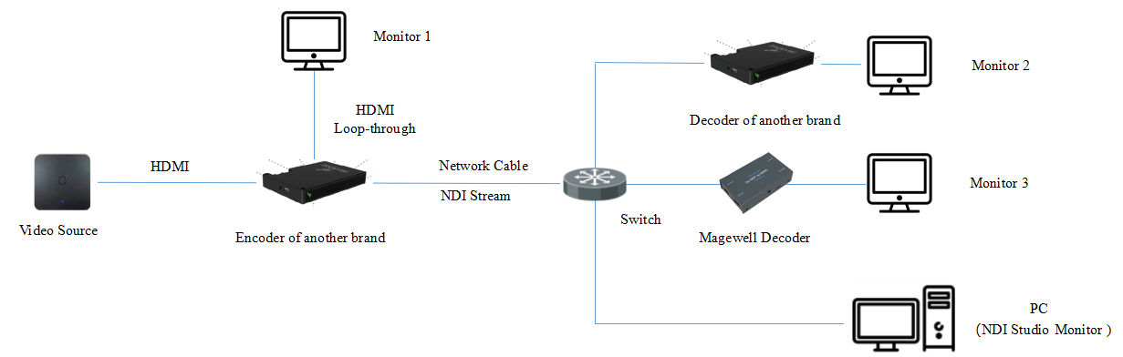 For decoding, Magewell Pro Convert for NDI® to HDMI (hereinafter referred to as "Magewell NDI® decoder"), the decoder of another brand and NDI Studio Monitor are connected to the same LAN. And the decoded video by hardware decoders are output to Monitor 2 and Monitor 3 for display through the HDMI interface, while the decoded video by NDI Studio Monitor is displayed on PC directly.