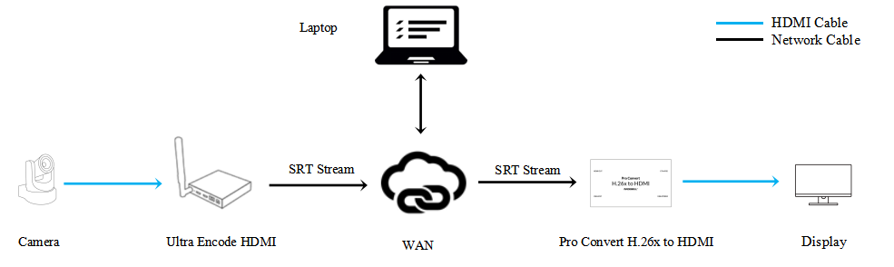 In these examples, we use a Magewell Ultra Encode HDMI encoder and Pro Convert H.26x to HDMI decoder to create an end-to-end SRT transport workflow. The content flow is outlined in the device connection diagram below.