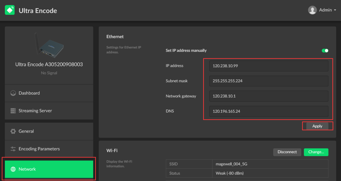1. Log into the Web GUI of the Ultra Encode device and go to the "Network" tab. In the "Ethernet" section, turn on the "Set IP address manually" switch, and fill in the IP address, Subnet mask, and other information. (Note that since this device will be the Listener, the IP address must be a fixed/static IP address accessible on the public network.) Click "Apply".
