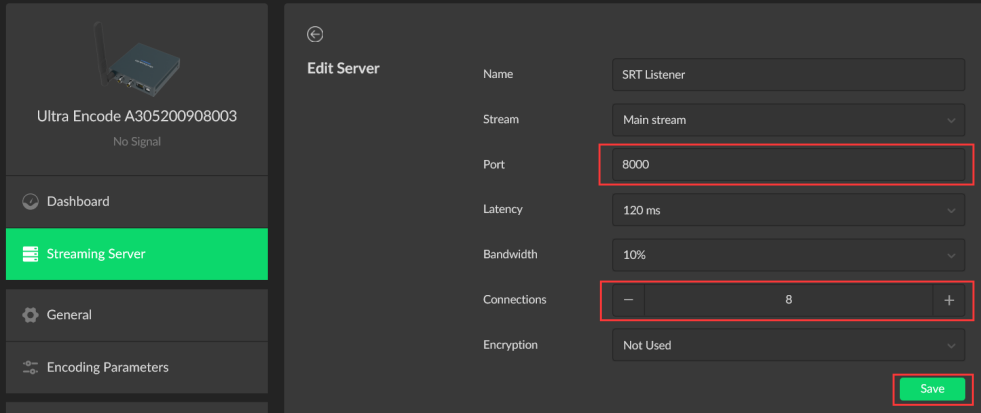 3. Fill in the port number in the pop-up page (8000 in our example), select the number of connections (SRT Listener supports up to 8 clients at the same time), and click "Save". The encoder will begin streaming once a connection is initiated by an SRT Caller.