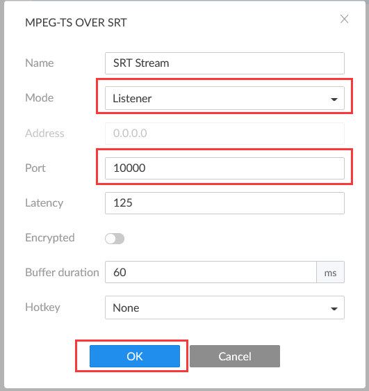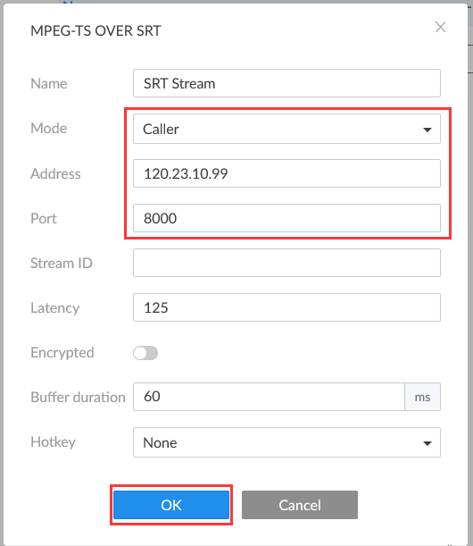 2. On the pop-up page, select "Caller" for the mode. In the Address field, enter the public IP address of the encoder. Enter the Port number (consistent with the port number set in the encoder), and click "OK".