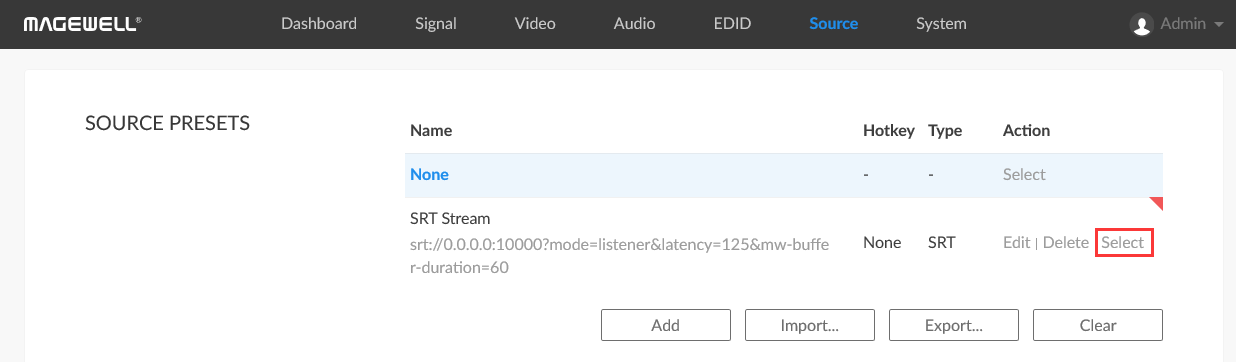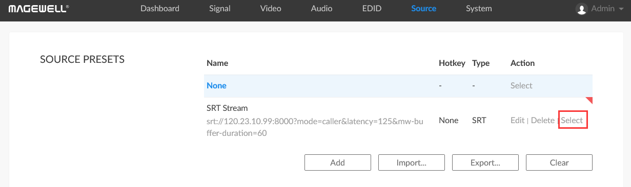 3. The settings you just added will now be displayed in the “SOURCE PRESETS” list. Click "Select" to decode the SRT streams sent from the encoder.