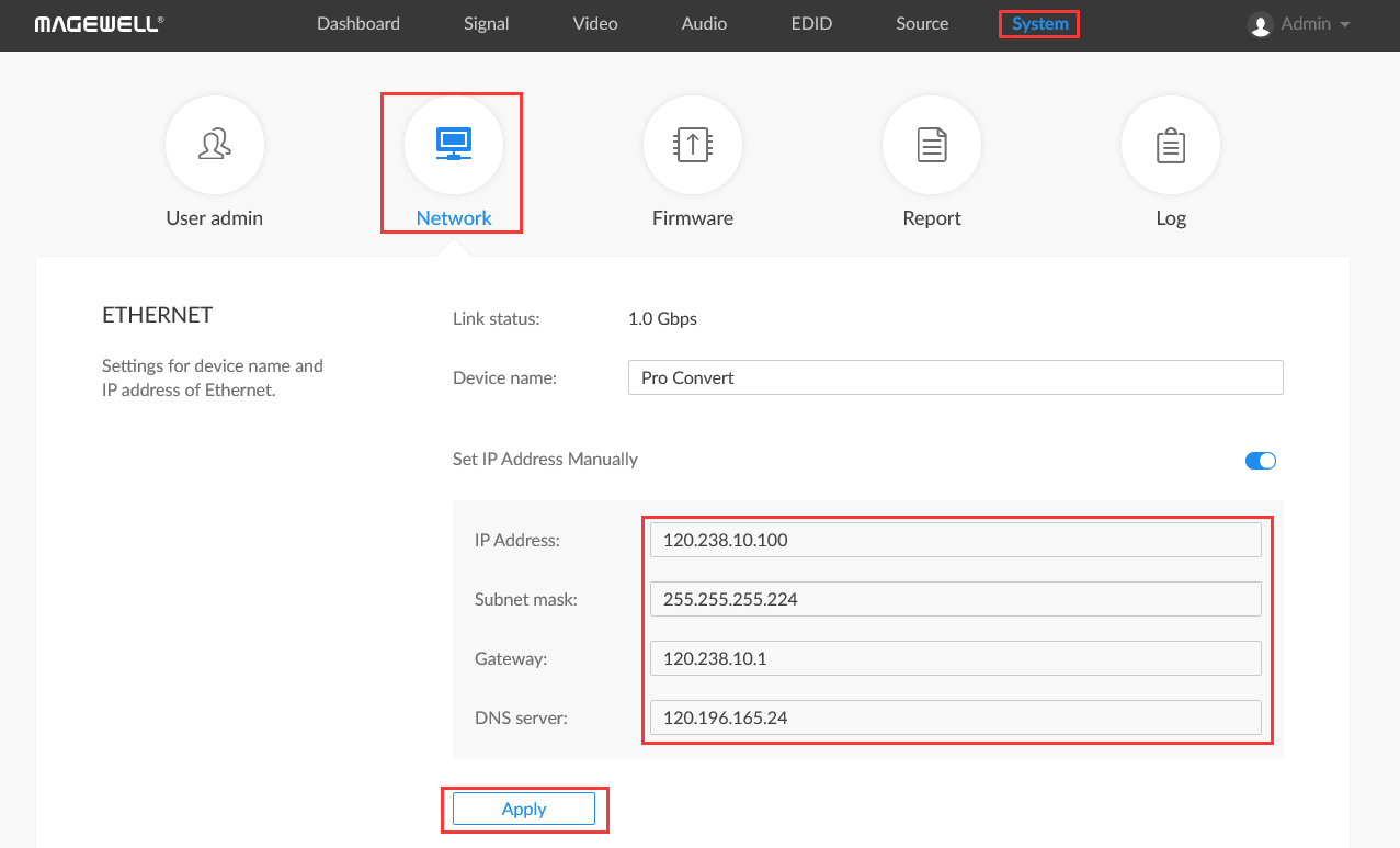 1. Log into the Web GUI of the Pro Convert decoder. Click the “System” tab in the top menu, then click the “Network” icon. Turn on the "Set IP Address Manually" switch, then fill in the IP address, Subnet mask, and other information. (Note that since this device will be the Listener, the IP address must be a fixed/static IP address accessible on the public network.) Click "Apply".