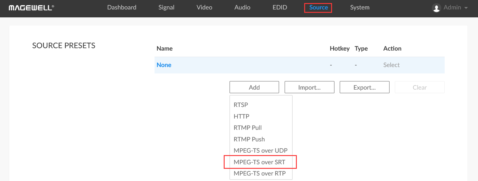 2. Enter the "Source" tab. In the "SOURCE PRESETS" section, click "Add" and select "MPEG-TS over SRT".