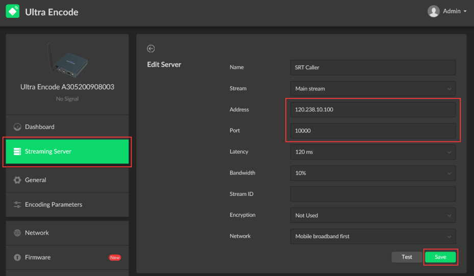 2. On the pop-up page, in the Address field, enter the public IP address of the decoder. Enter the port number (consistent with the port number set in the decoder), and click "Save". The encoder will initiate a connection with the SRT Listener (decoder) and begin streaming.