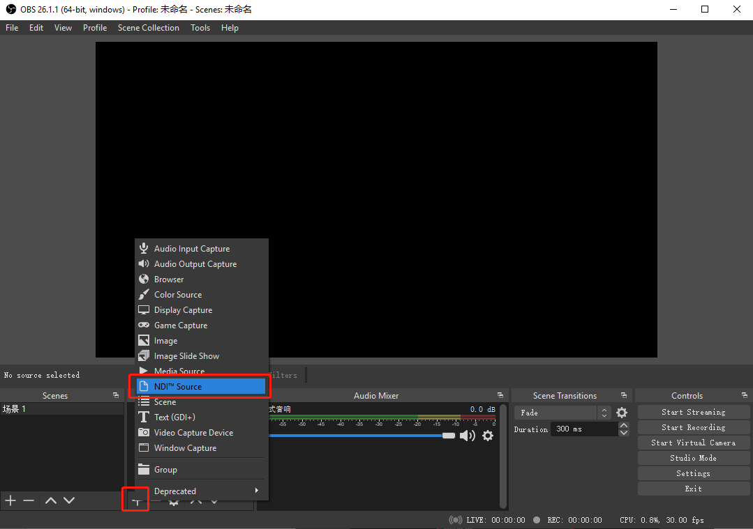 1. In the OBS software, click "+" in the "Sources" column and select "NDI™ Source" in the pop-up list.