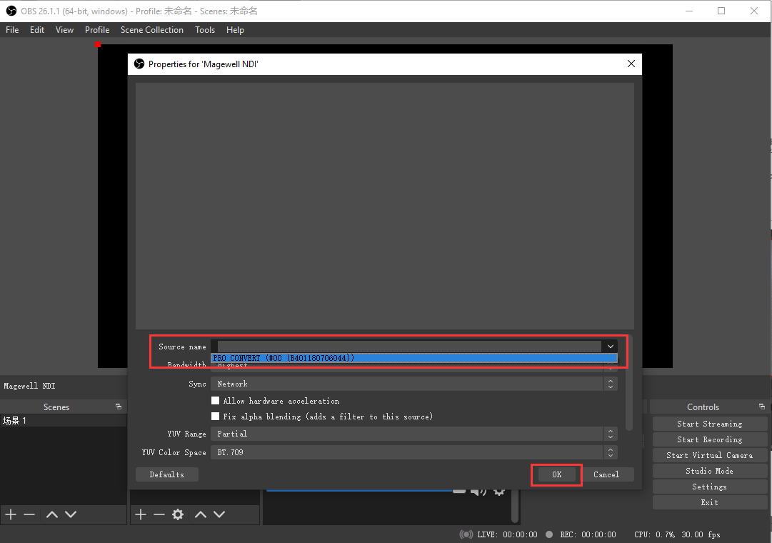 3. In the pop-up Properties page, click the drop-down arrow to the right of "Source name." All NDI streams currently available on the network will be displayed. Select the NDI stream being sent by the Pro Convert encoder, then click "OK." The NDI stream can now be used as an OBS source.