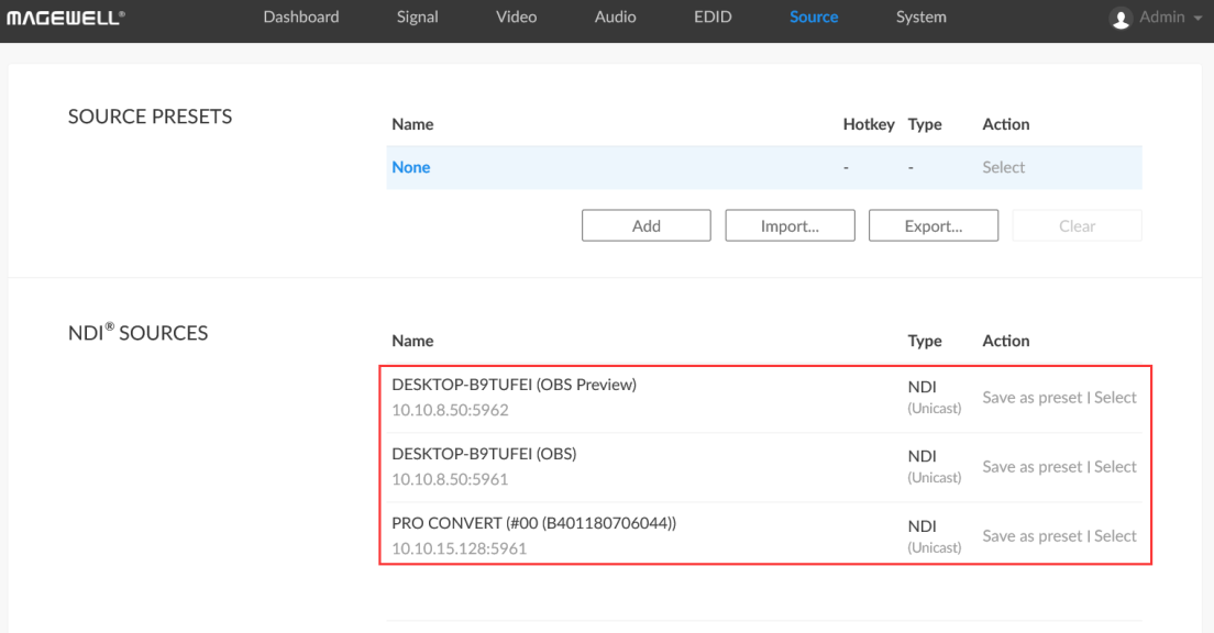 3. Log into the Web GUI of the Pro Convert decoder and click the "Source" tab. In the "NDI® SOURCES" section, all NDI streams currently available on the network will be displayed. Select the NDI stream that you want to receive from OBS (the main output or the preview output), and the decoded NDI stream will be displayed on the monitor connected to the decoder.