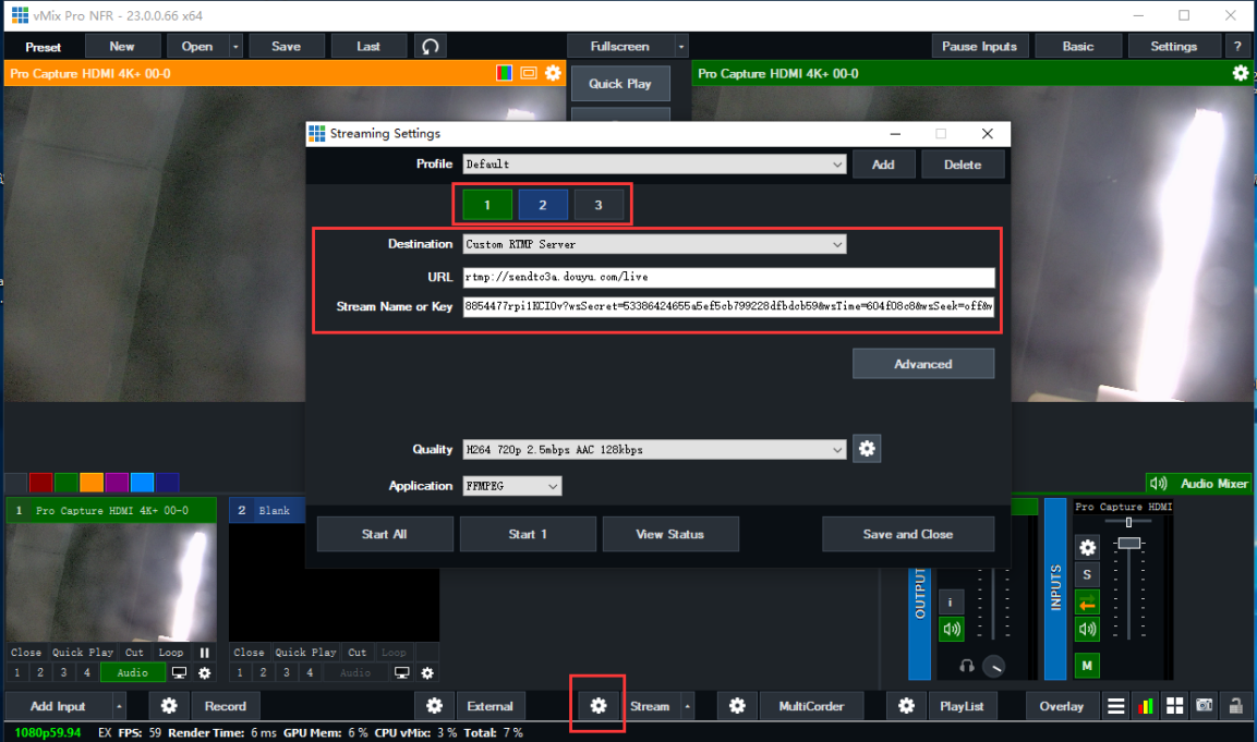 Software such as vMix and Wirecast allows you to multistream to multiple destinations. It should be noted that the more simultaneous streaming destinations you have, the higher your CPU processing performance and network bandwidth requirements will be. This increases the possibility of issues such as dropped frames or buffering, and may also impact the encoding quality of your streams. Therefore, if you want to use software for multi-platform live streaming, ensure that your computer is sufficiently powerful and that you have enough available network upload bandwidth.