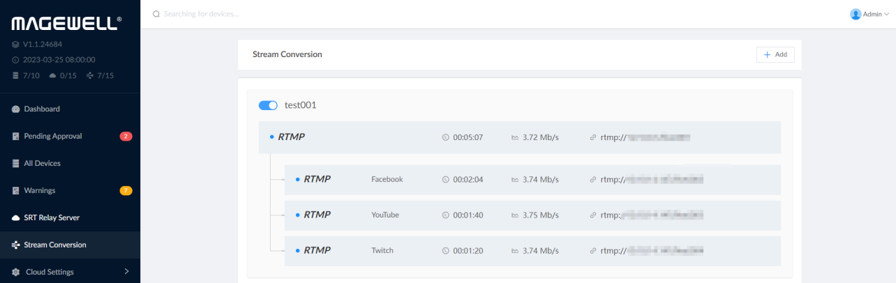 Unlike the above two solutions, cloud-based platforms do not require hardware encoders or software with multi-channel streaming, and you only need to worry about sufficient bandwidth for a single stream. With cloud-based multistreaming solutions, one source stream is sent to the cloud platform, which then re-streams it to the additional locations. Although some latency will be added, it is negligible in most scenarios. The streaming protocol conversion function of the Magewell Cloud software can convert streams bi-directionally between RTMP and SRT. It also allows users to push a single RTMP stream to Magewell Cloud, which is then copied into multiple streams by Magewell Cloud and pushed to multiple destinations.