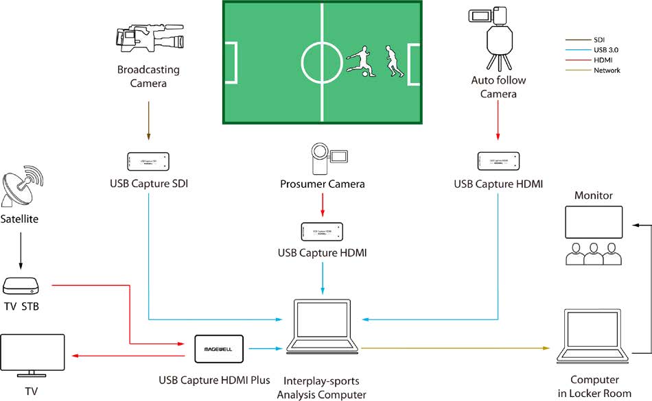 To capture the live video for this analysis, multiple video sources – most commonly broadcast, professional or consumer video cameras, but also television feeds, cable set-top boxes and other computers playing video streams – must be connected to a Windows-based analysis computer running the Interplay-sports software.
